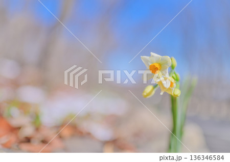 雪残る公園で咲く水仙