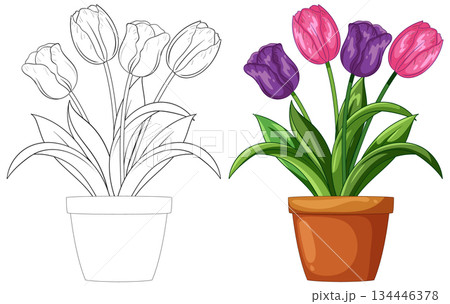 Potted Tulips Vector Illustration with Color and Outline Versions