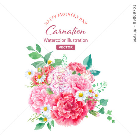 色々なカーネーションの水彩イラスト。アレンジメント。母の日の装飾(ベクター。花のレイアウト変更可能)