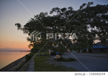 夜明けの琵琶湖畔とあのベンチ 横構図50