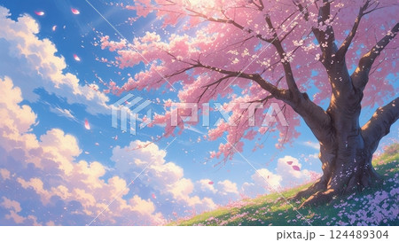 春風に舞う桜の花びらと幻想的なピンクの空背景