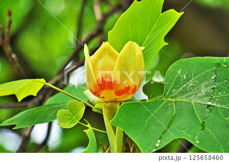 黄色とオレンジ色の交じったユリノキの花(春、五月)