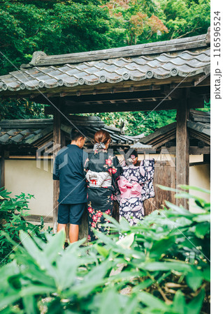春風萬里荘の縁側に仲良く座る浴衣の男の子と女の子