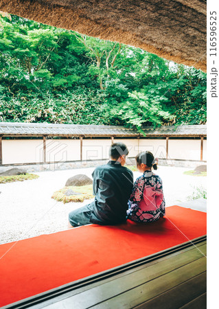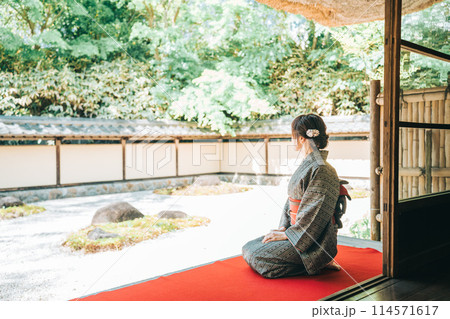 春風萬里荘の枯山水庭園の和室にてくつろぐ若く美しい着物女性