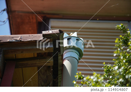 白いペンキで塗装したトタン壁と簾とモルタル壁・昭和の匂いが残る街富士吉田