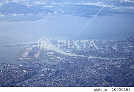 新宿上空から見る多摩川河口付近の東京湾と対岸に房総半島を望むパノラマ