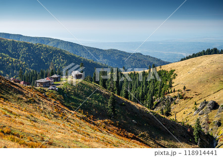 Beautiful autumn mountain landscape with colorful trees and old houses.