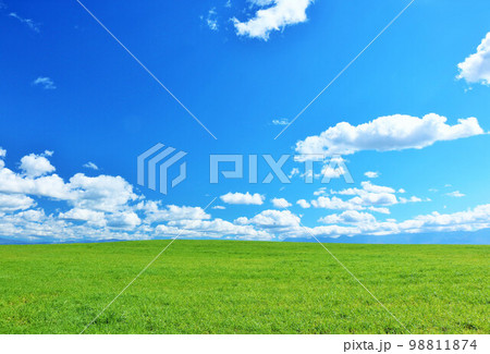 北海道 夏の青空と新緑の草原風景