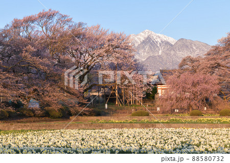 北杜市武川町、山高実相寺、庭の水仙の花と桜・冠雪の甲斐駒