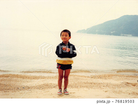 昔のフィルム写真 ビーチに立つ小さな男の子