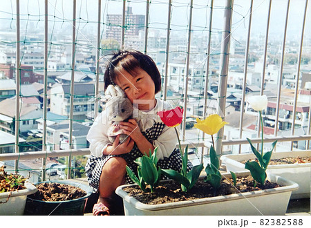 昔のフィルム写真 ベランダのチューリップと二人の姉妹