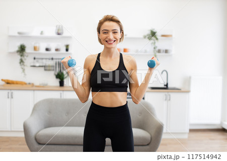 Smiling woman exercising with dumbbells at home in modern kitchen
