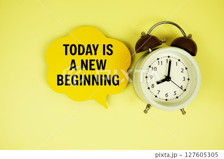 Today is a New Beginning text on speech bubble with alarm clock on yellow background