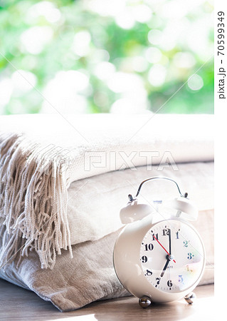 目覚まし時計とベッドリネン