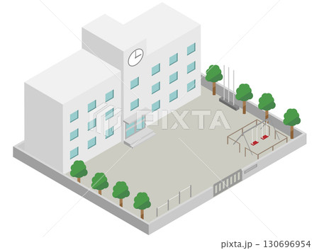 アイソメトリックな小学校の校舎と校庭のイメージ素材
