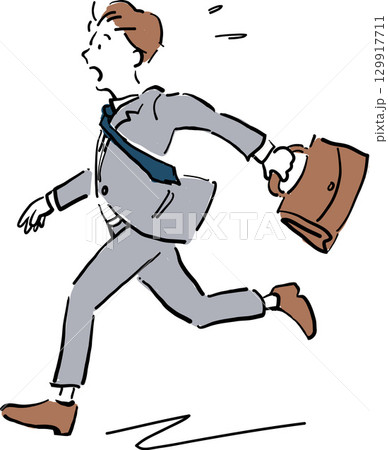 ビジネスバッグを持ってスーツを着たメガネの男性が腕時計で時間を確認しながら歩く姿の全身のイラスト