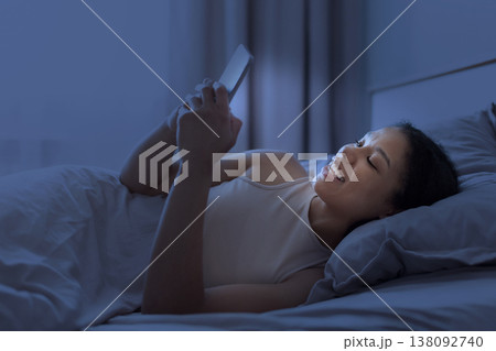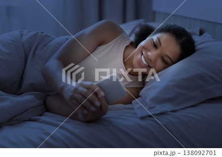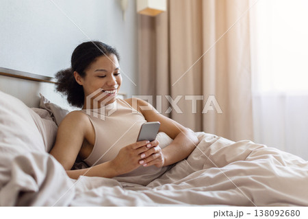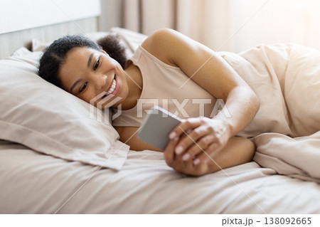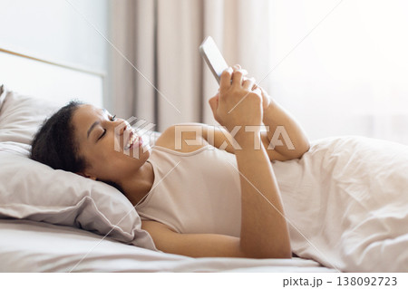 A cheerful young woman typing on her smartphone, using social media, socializing, lying on the couch