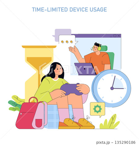 A vector illustration depicting a person managing device time with visual elements like an hourglass, clock, and laptop. Highlights limitations on device use through digital timing.