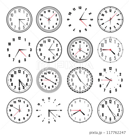 Mechanical clock faces with hands, bezel. Watch dial with minute, hour marks and numbers, arabic numerals. Timer or stopwatch element. Measuring circle scale with divisions. Vector illustration