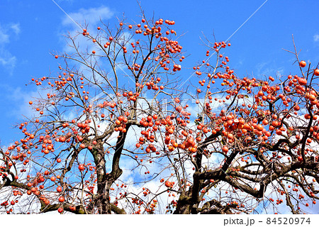 秋の陽に映える柿の実 晩秋の風景 晩秋イメージ