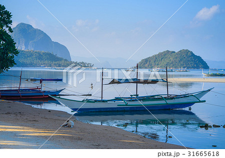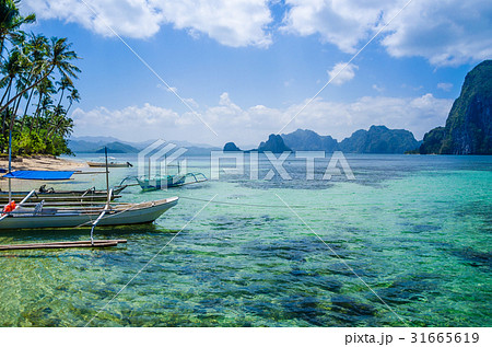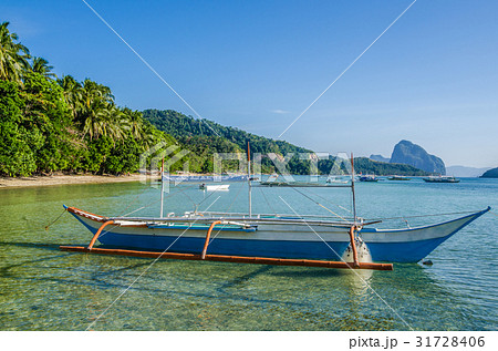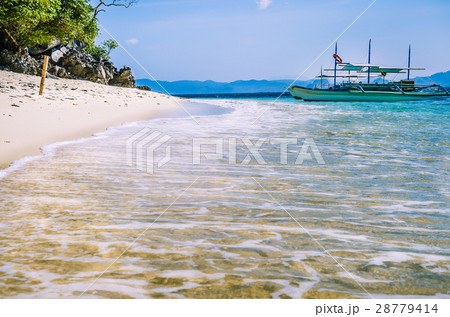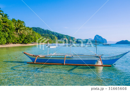 Traditional banca fishermen boat in shallow lagoon on Corong Beach. Nido, Philippines. Blue sky and