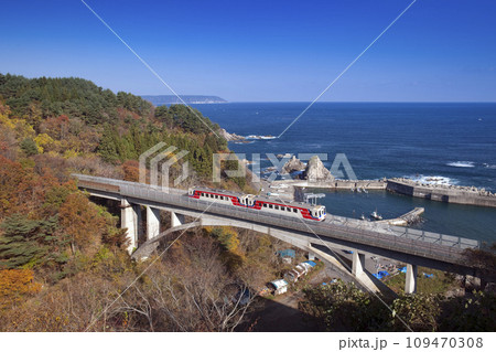 秋の三陸鉄道の鉄橋と電車と漁港