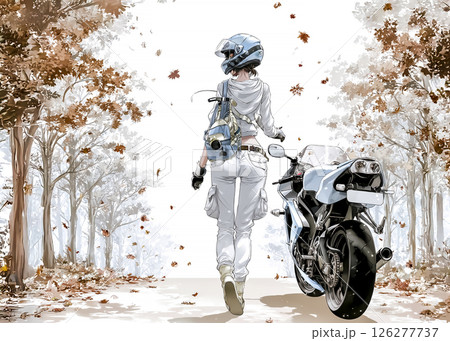 スポーツバイク紅葉でツーリングをする女性ライダーのイラスト素材