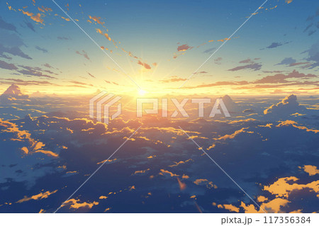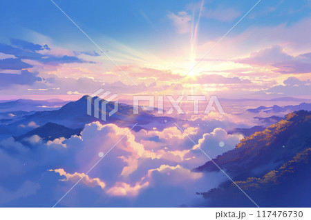 アニメ調の日の出と雲海 AI画像