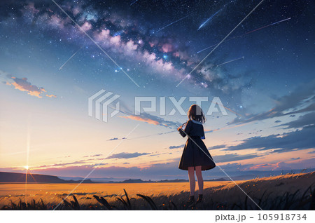 天の川を背景にこちらを振り返る美少女の後ろ姿「AI生成画像」