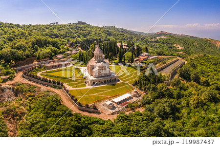 Aerial top view of the Bodbe Monastery architectural complex of St. Nino. View from above to church, Alazani Valley, Greater Caucasus mountains, in sunny summer day. Sighnaghi city, Kakheti, Georgia.