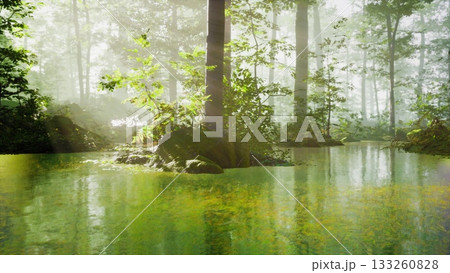 Sunlight filters through lush green trees, creating shimmering reflections on calm waters. The serene scene invites a moment of peace in natures embrace at early morning.