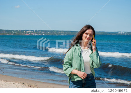 Young caucasian woman with long hair talks on phone at sunny beach, wearing a green jacket and jeans, enjoying waves with a clear blue sky above. Digital nomad lifestyle. Remote work
