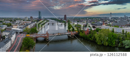 Aerial view of Frankfurt, Germany, featuring the Main River, European Central Bank, bridges, lush greenery, and a dramatic orange and purple sunset.
