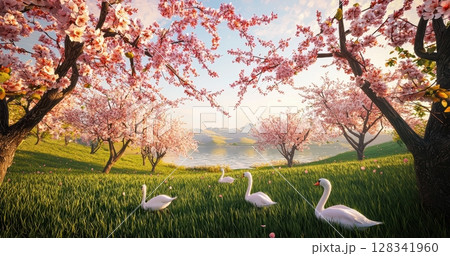 A serene and beautiful Cherry Blossom landscape embellished with graceful swans