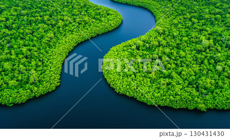 Landscape background Aerial view of winding river surrounded by lush green forests, showcasing beauty of nature and tranquility. vibrant greenery reflects serene environment