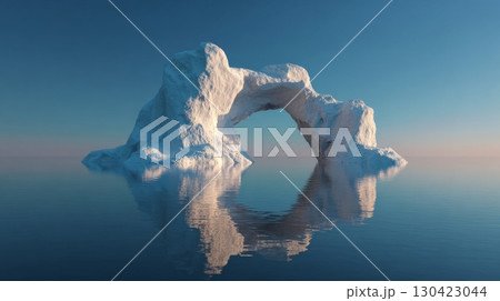 Majestic white iceberg with arch formation reflected on the calm sea at sunset