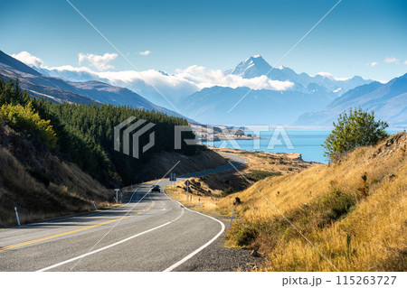 Scenic road trip of Mt Cook over winding road and Lake Pukaki on sunny day at New Zealand
