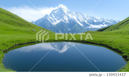Landscape background serene alpine valley featuring tranquil pond reflecting majestic snow capped mountains under clear blue sky. lush green landscape enhances breathtaking view
