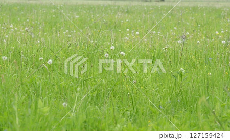 A Beautiful, Lush Green Meadow Featuring Dandelions in Full Bloom and in Abundant Growth