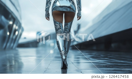 Futuristic woman in silver outfit walking on city street