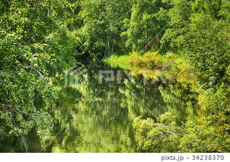 Alley of lush green poplar trees reflected in the water on sunny summer day
