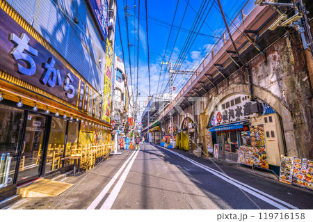 日本の東京都市景観10月。新橋駅烏森口寄り。高架下の飲み屋街などを望む。左奥は新橋駅方向=27日