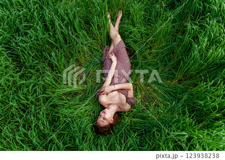 A young girl in a beautiful dress lies in the green grass