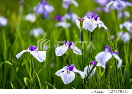 平咲きで白地に藤色の花被の花菖蒲/アヤメ科「オリエントエレガンス?」