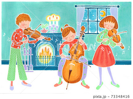 雪の夜に暖炉の前で弦楽器を演奏する三人の女の子