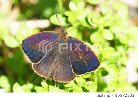 生き物 昆虫 ムラサキツバメ、千葉県産オスがアオキで日向ぼっこ。メスよりオスのほうが地味な色合いです