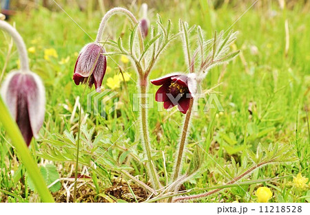 春の野の花・花弁(6枚の萼片)が下向きの時期のオキナグサ・横位置