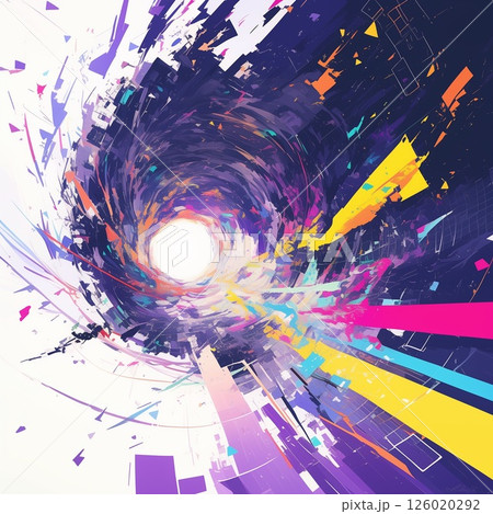暗闇に吸い込まれるカラフルな光の渦とラインの抽象アート