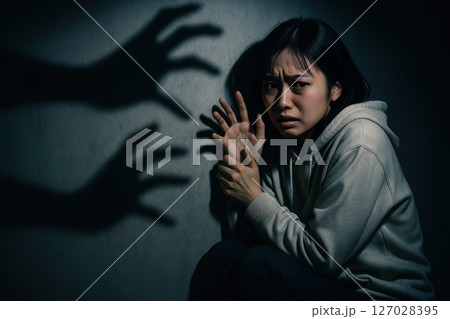 都市伝説系、影に追い詰められ恐怖する女性(AI生成画像)