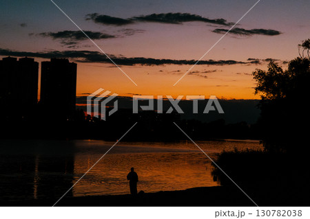 Vibrant sunset casting a warm glow over the lake and a lone fisherman. A stunning sunset bathes a tranquil lake, silhouetting buildings and a person fishing, creating a serene and peaceful atmosphere.